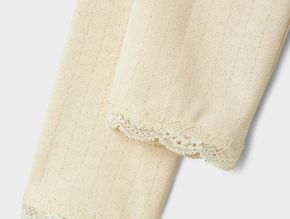 Leggings i farven summer sand med blondekant forneden fra Name It. De er lavet af 69% genanvendt polyester, 27% LENZING™ ECOVERO™ viskose og 4% elastan. Maskinvaskes ved 30° finvask.