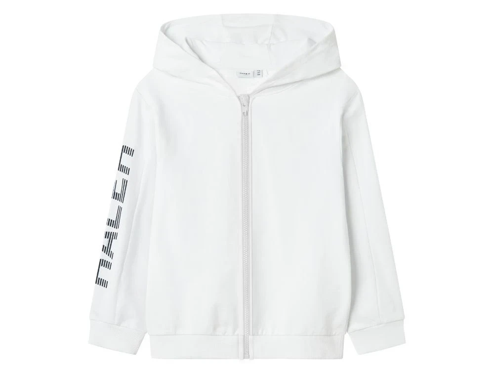 Dreng klædt i hvid sweatcardigan med hætte of Formel 1 print på ryg og ærme fra Name It 13242797 bright whiteHvid sweatcardigan med hætte og  Formel 1 print ærme fra Name It 13242797 bright whiteHvid sweatcardigan med hætte og Formel 1 print på ryg og ærme fra Name It 13242797 bright whiteFormel 1 inspireret print på ærmer på hvid sweatcardigan med hætte fra Name It 13242797 bright white