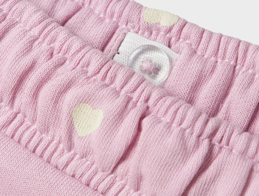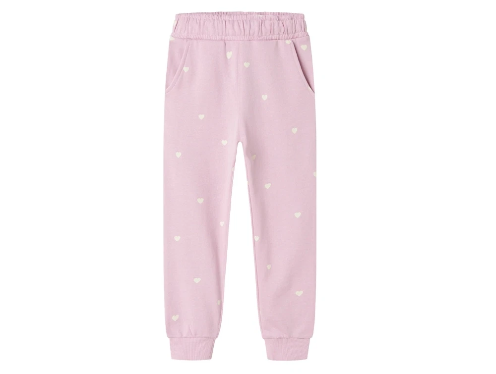 Bløde sweatpants i rosa nuance (corsage) fra Name It med små hvide hjerter trykt over hele stoffet. Bukserne har elastik i taljen med indvendig justering samt ribkanter ved anklerne for en god pasform.