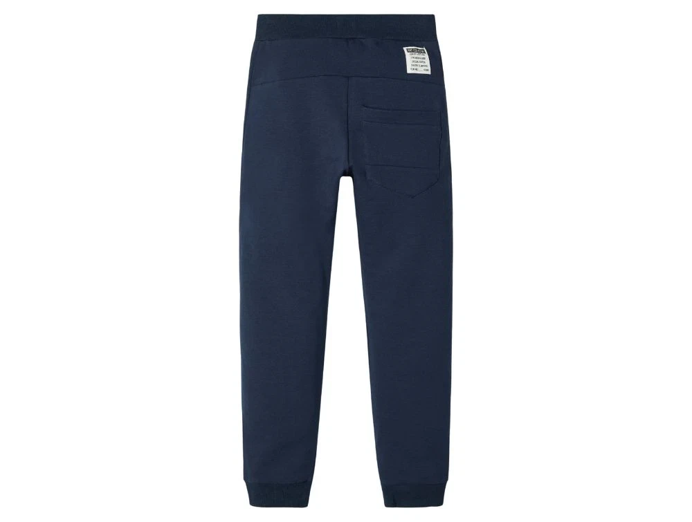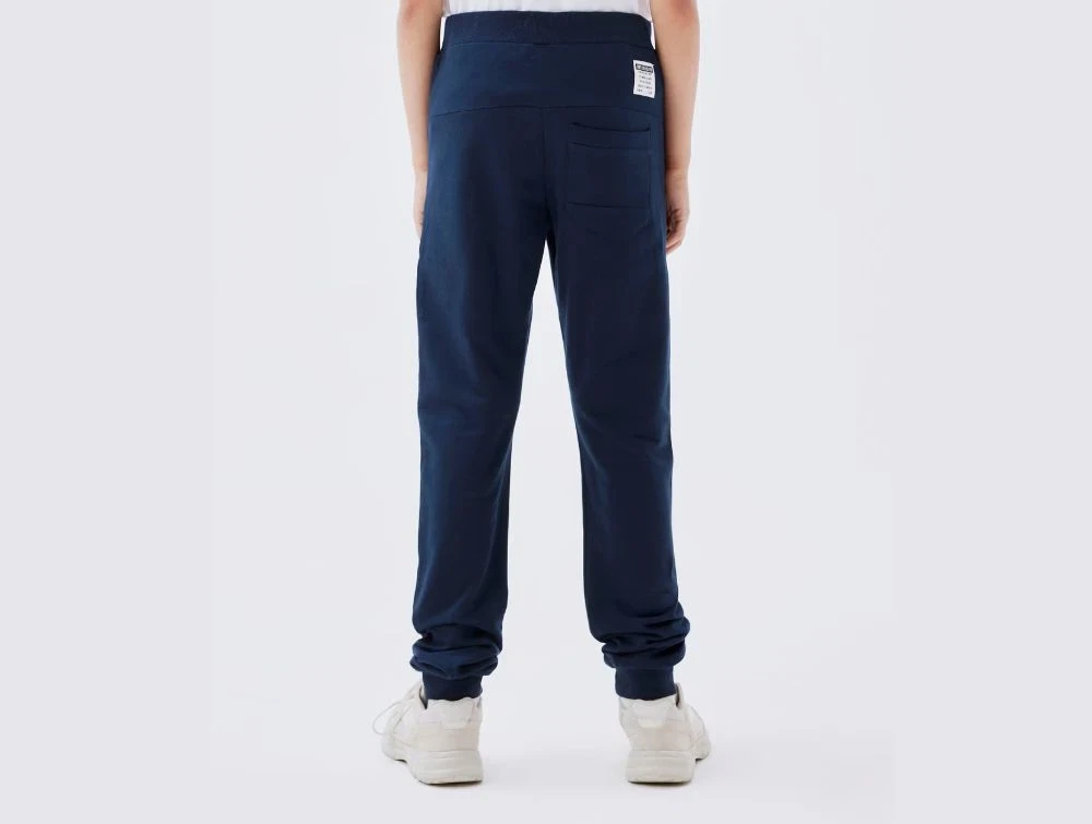 Dreng iført mørkeblå sweatpants fra Name It med rib og snøreSweatpants fra Name It i dark sapphire med justerbar talje og lynlåslommerBagside af mørkeblå Name It sweatpants med label og baglommeNærbillede af snøre og lynlås på Name It sweatpants i navySweatpants fra Name It set bagfra på model iført hvide sneakers