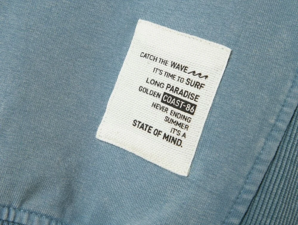 Blød sweatshirt i en blålig nuance med et forvasket udtryk. Den har en kile med rib i hver side og et lille mærke med teksttryk foran. Modellen har rund hals og lange ærmer med ribafslutning.