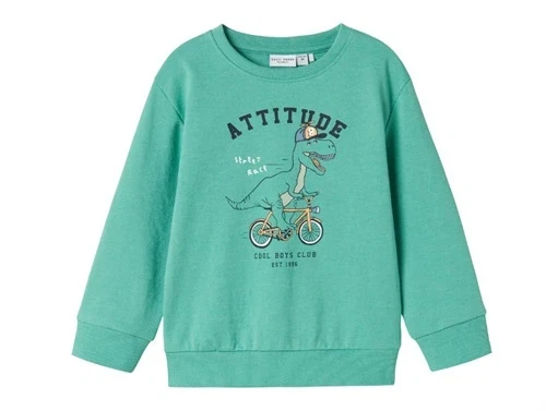 mintgrøn sweatshirt fra name it med print af dinosaur på cykel og teksten attitude, set forfra