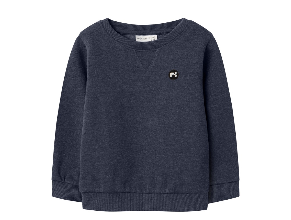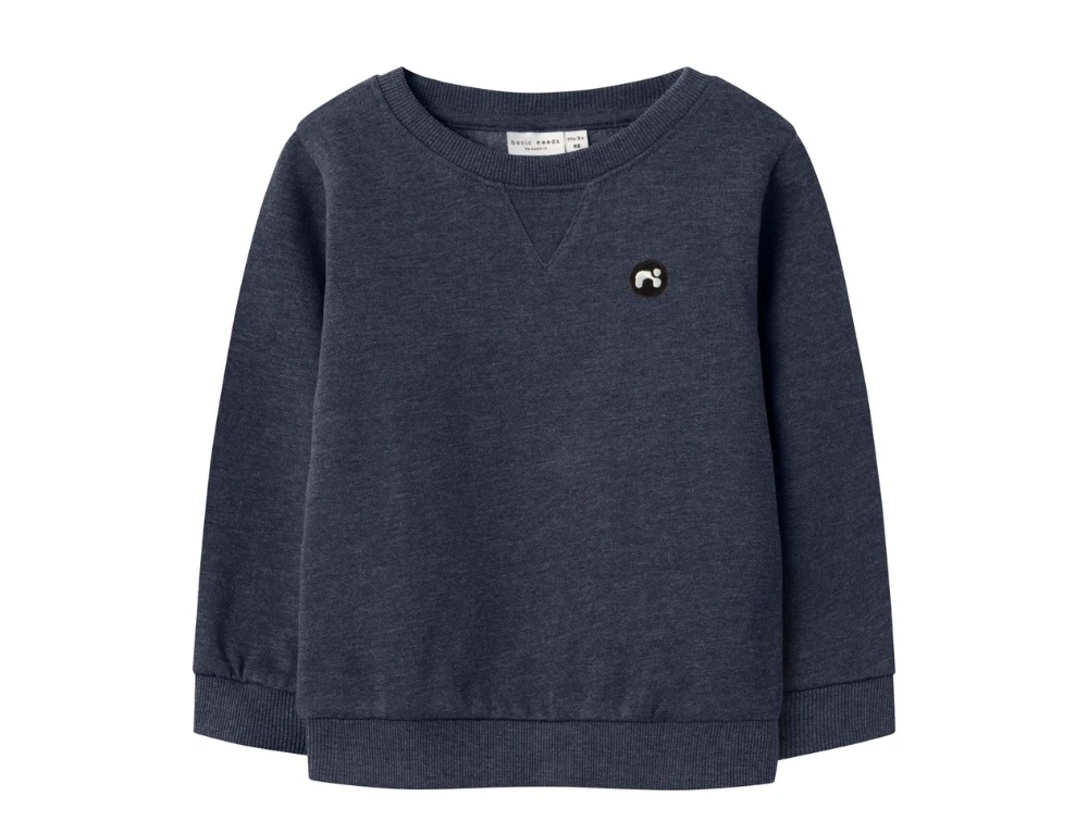 Sweatshirt i mørkeblå nuance fra Name It. En blød og alsidig trøje i loop back kvalitet med rund hals og lille badge på brystet, der giver et afslappet udtryk.