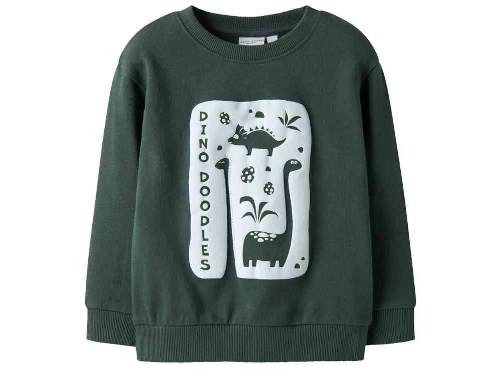 Sweatshirt i grøn nuance fra Name It med sjovt print af dinosaurer og planter. Designet er enkelt med et børnevenligt motiv og blød kvalitet i 100% bomuld for optimal komfort.