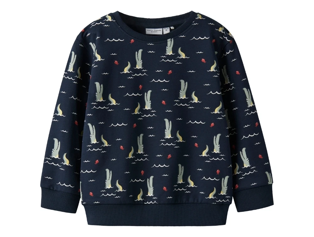 Sweatshirt i mørkeblå nuance (navy blazer) fra Name It. Printet forestiller små alligatorer i vandet og små røde fisk fordelt over hele stoffet. Ribkanter ved hals, ærmer og bund.