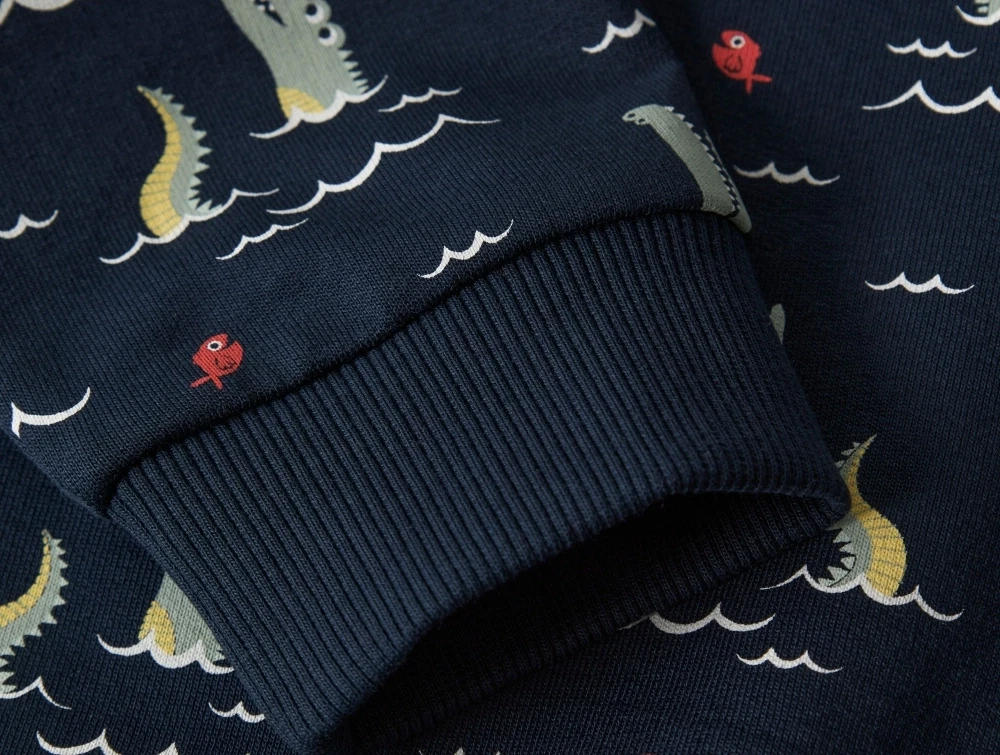 sweatshirt fra Name It i navy med print af alligator og fiskærmekant på mørkeblå sweatshirt med alligatorprint fra Name It