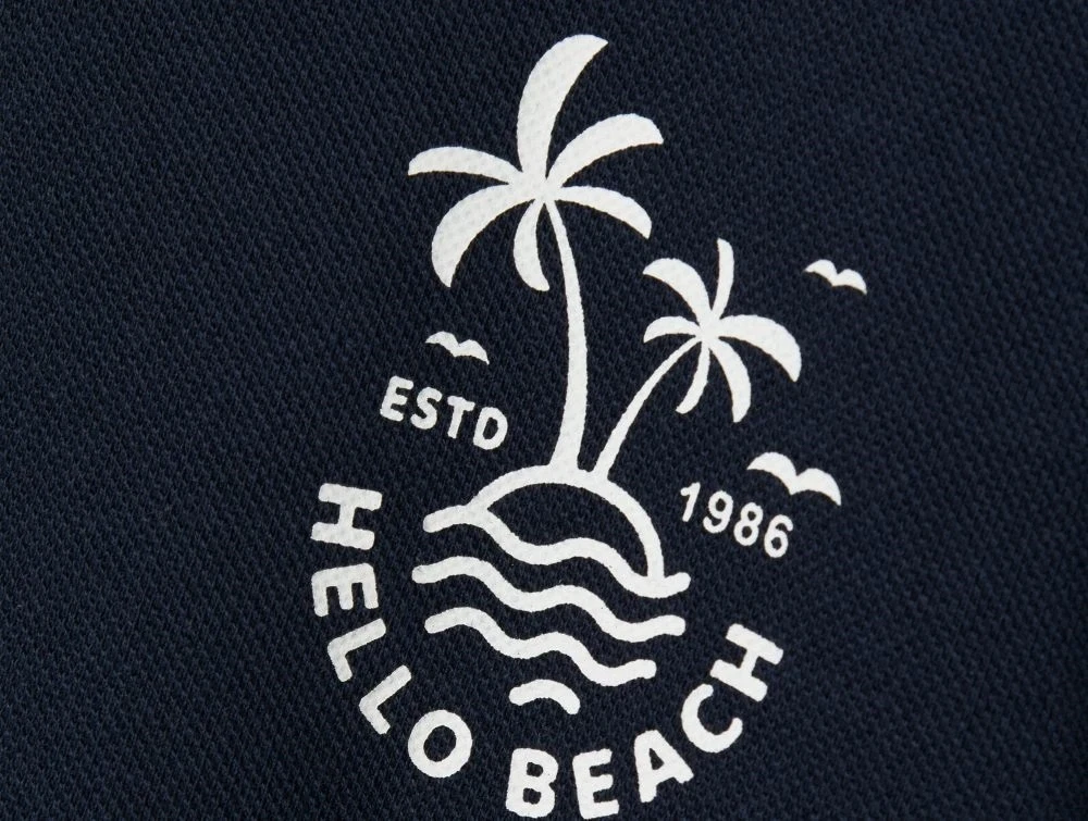 mørkeblå sweatshirt fra name it med hvidt hello beach print på brystetnærbillede af hvidt tryk med palmer og hello beach tekst på navy sweatshirt fra name it