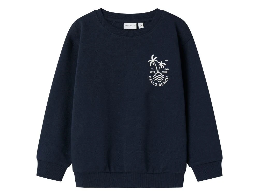 Sweatshirt i mørkeblå (navy blazer) fra Name It med et enkelt hvidt print på brystet med palmer, bølger og teksten "HELLO BEACH".