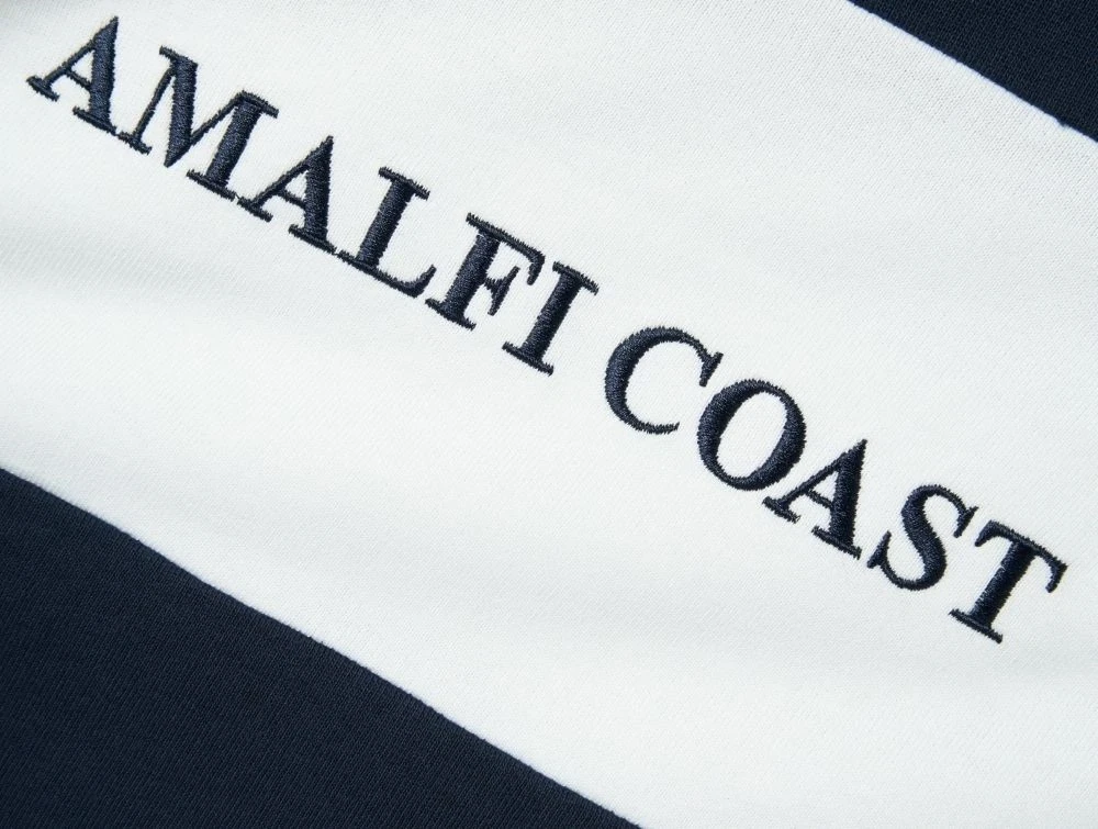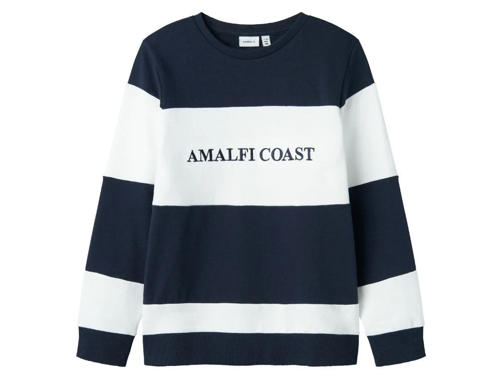 Cool sweatshirt i mørkeblå med brede hvide striber og teksten 'Amalfi Coast' broderet på brystet. Modellen har rund hals, korte ærmer og ribkanter. Lavet i en ubørstet sweatkvalitet med glat overflade, som gør den behagelig at have på. Perfekt til et afslappet og moderne hverdagslook.