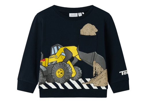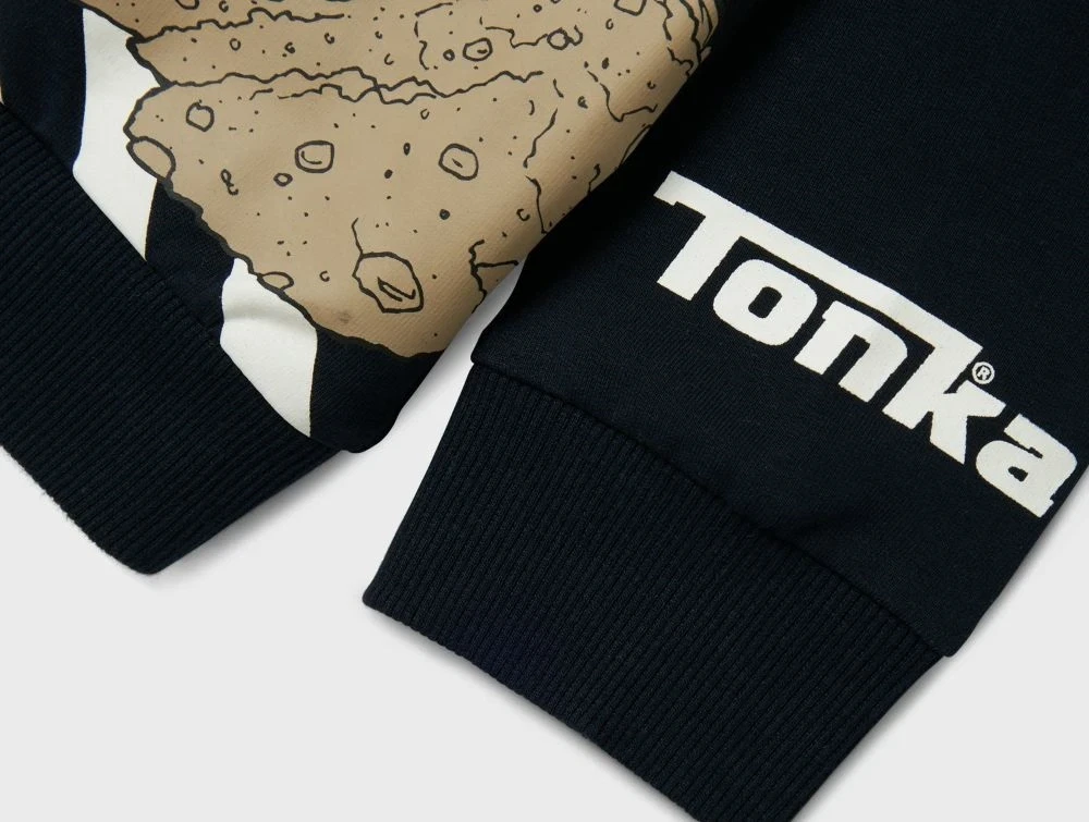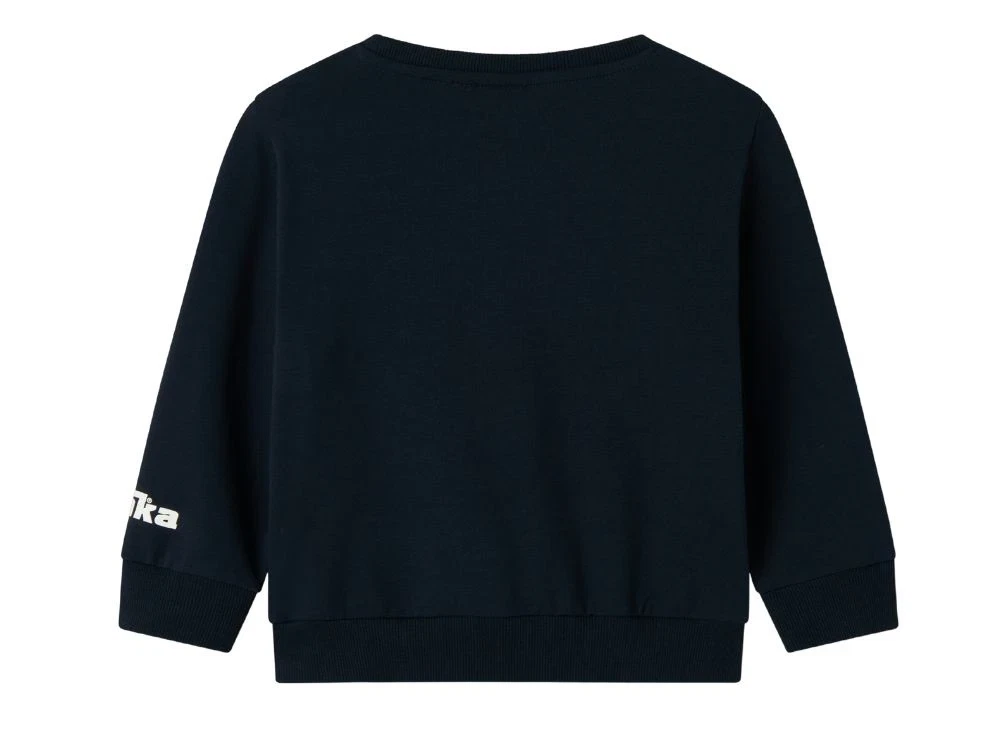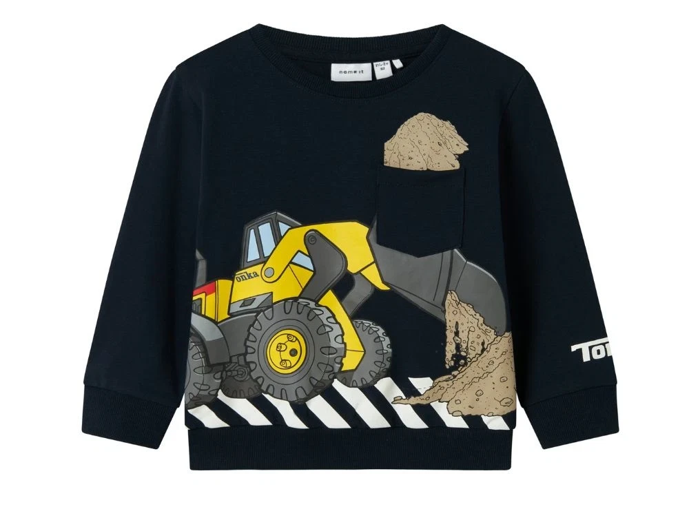 Sweatshirt i farven navy blazer med Tonka print fra Name It. Tonka er et legetøjsmærke, der er kendt for sine robuste og holdbare legetøjsbiler, især lastbiler og entreprenørmaskiner. Mærket blev grundlagt i USA i 1947 og blev hurtigt populært for sine legetøjsmetalbiler, der kunne tåle hård leg og udendørs brug. Tonka er især elsket for sine ikoniske gule dumpere og gravemaskiner, som ofte bruges til at simulere byggepladsleg.