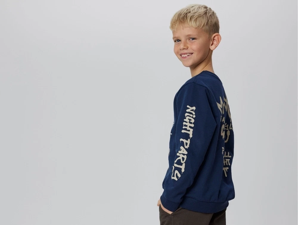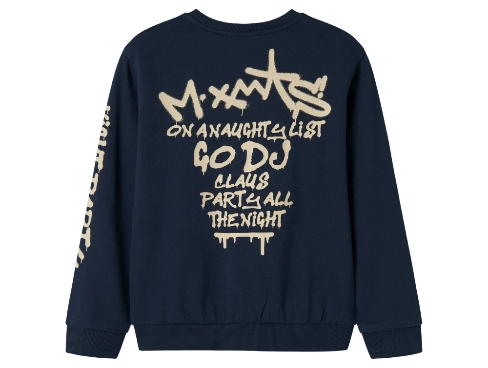 Name It sweatshirt i navy blazer med julemand DJ printDreng iført Name It sweatshirt i navy blazer med julemand printDetalje af julemand DJ print på Name It sweatshirtBagside af Name It sweatshirt navy blazer med graffiti print