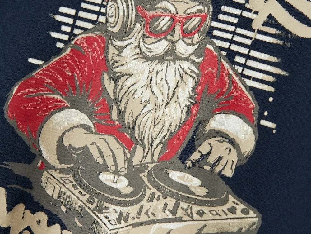 Foran ses et stort print af julemanden som DJ ved et mixerpult, mens ærmer og ryg har graffiti-inspireret skrift.