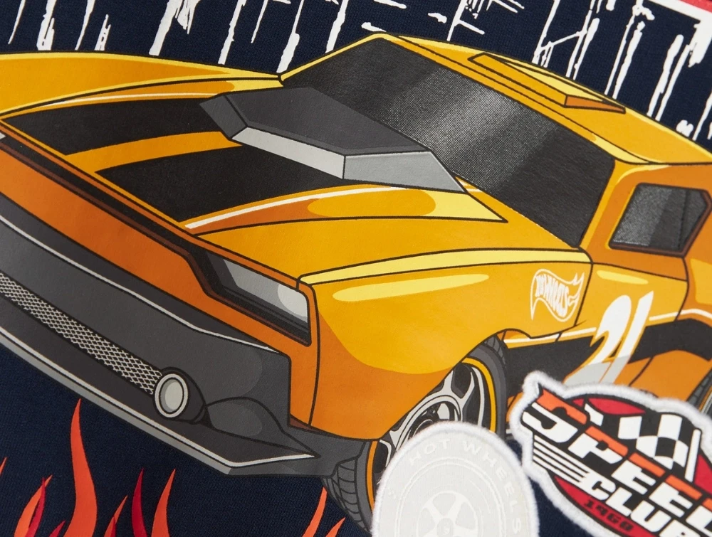 Blusen er dekoreret med et markant Hot Wheels motiv med racerbil, flammer og logo, som giver et sejt look. De orange detaljer på ærmer og kant fuldender designet med kontrast. Perfekt til børn, der elsker fart og biler.