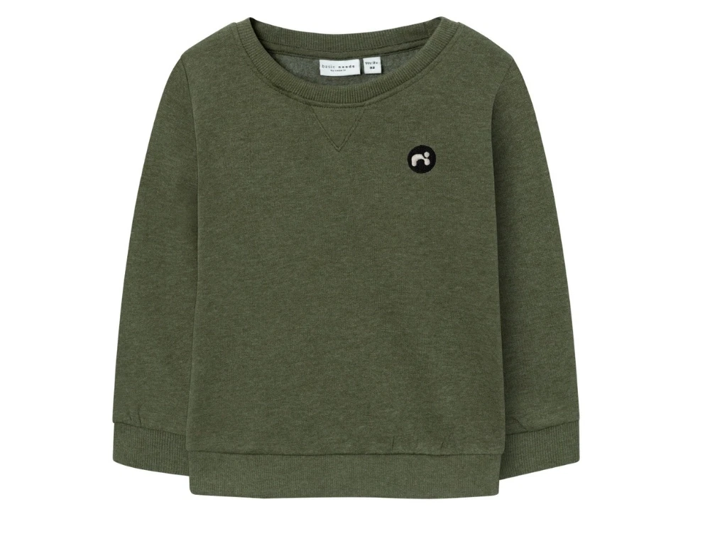 Sweatshirt i mørkegrøn nuance fra Name It. En klassisk trøje i blød loop back kvalitet med rund hals og lille badge på brystet, der giver et afslappet og sporty udtryk.