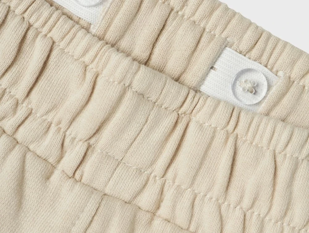 Taljen har justerbar knaphulselastik indvendigt og bindebånd foran for optimal pasform. Fremstillet i ubørstet sweatkvalitet i økologisk bomuld.