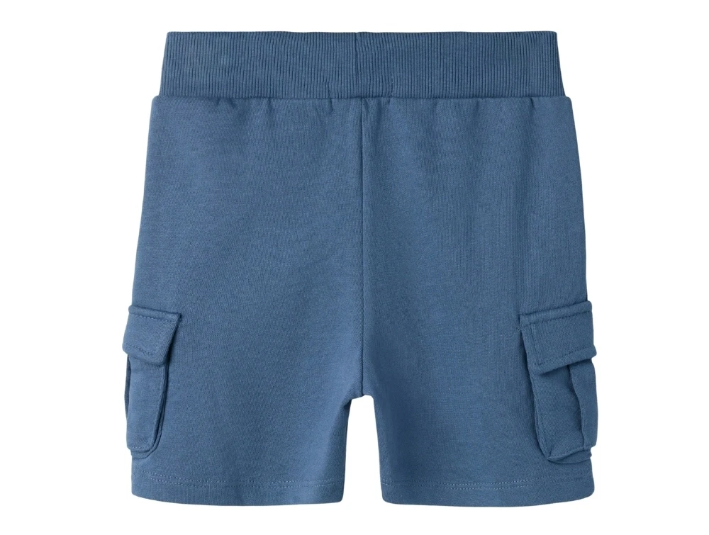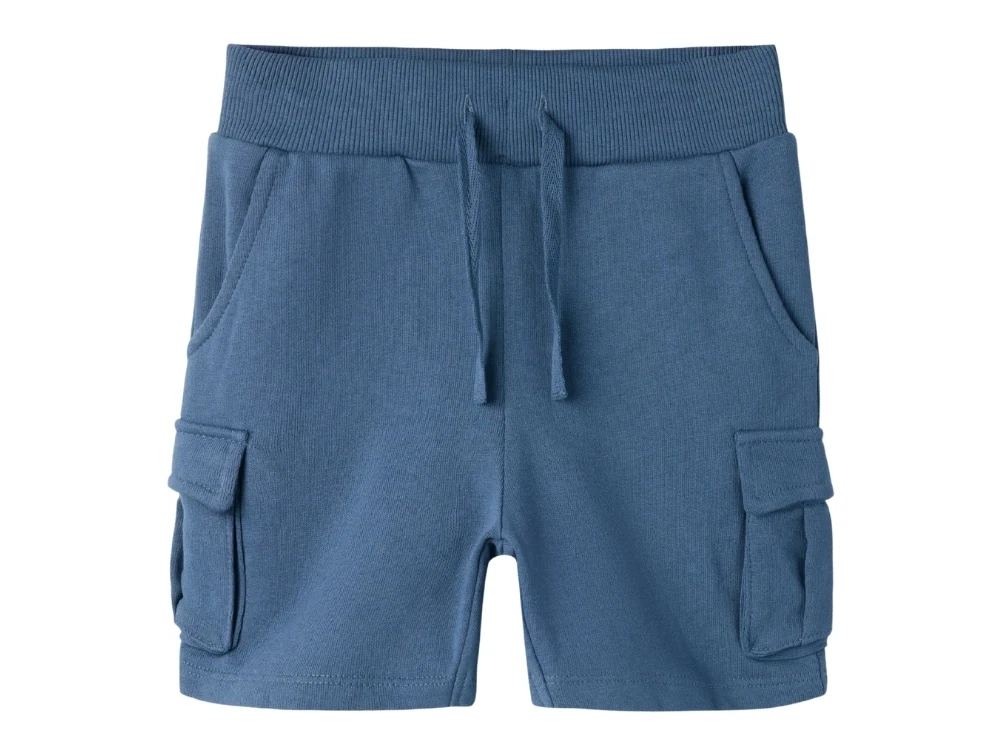 Sweatshorts i blå nuance (Vintage Indigo) fra Name It med cargolommer på siderne og snøre i taljen.