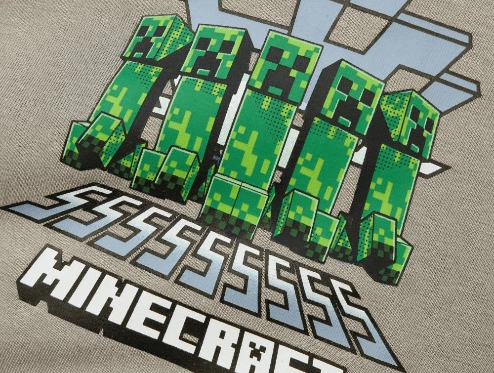T-shirten har en afslappet pasform, rund hals og korte ærmer. Den er lavet i en blød og strækbar jerseykvalitet, som sikrer høj komfort. Foran er et mindre Minecraft-print med Creepers og teksten "SSSSSSSS", mens bagsiden har et stort print af en Creeper med TNT og teksten "BOOM!" – perfekt til små Minecraft-fans.