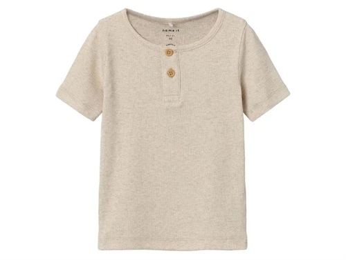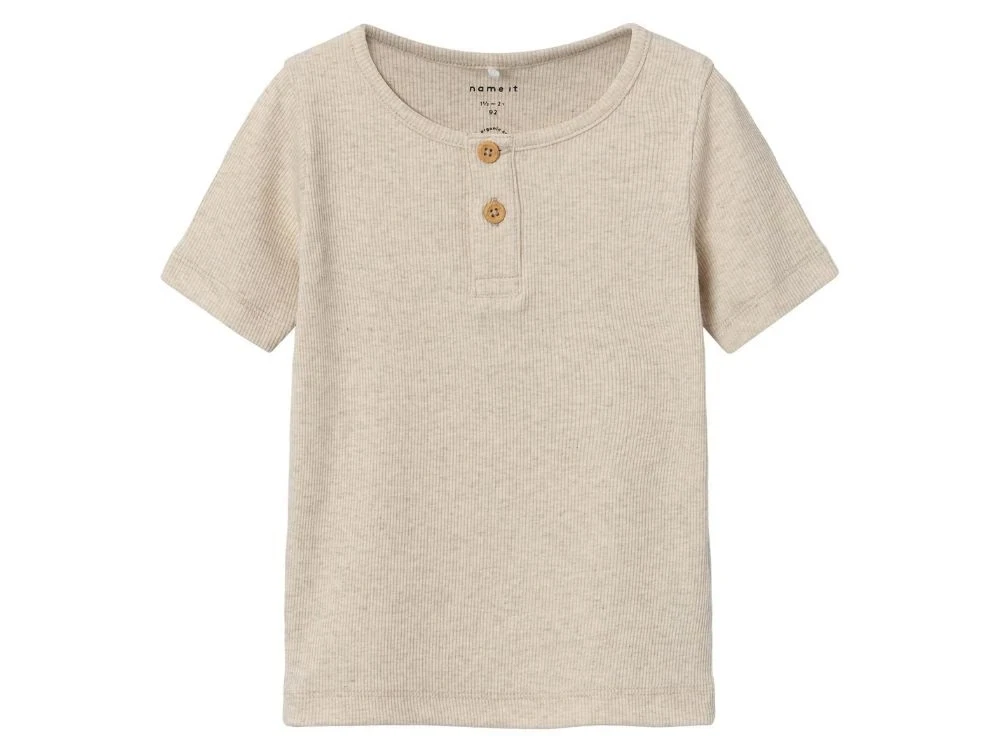 Kortærmet rib t-shirt i meleret beige (peyote melange) med to knapper ved halsåbning fra Name It.