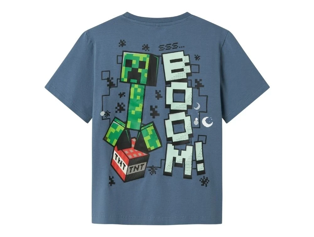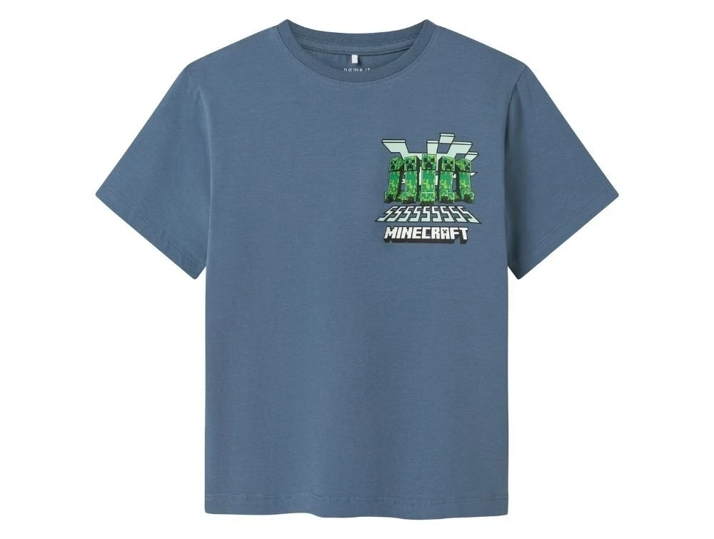 T-shirt i blå (blue mirage) med stort Minecraft-print foran og bagpå fra Name It.