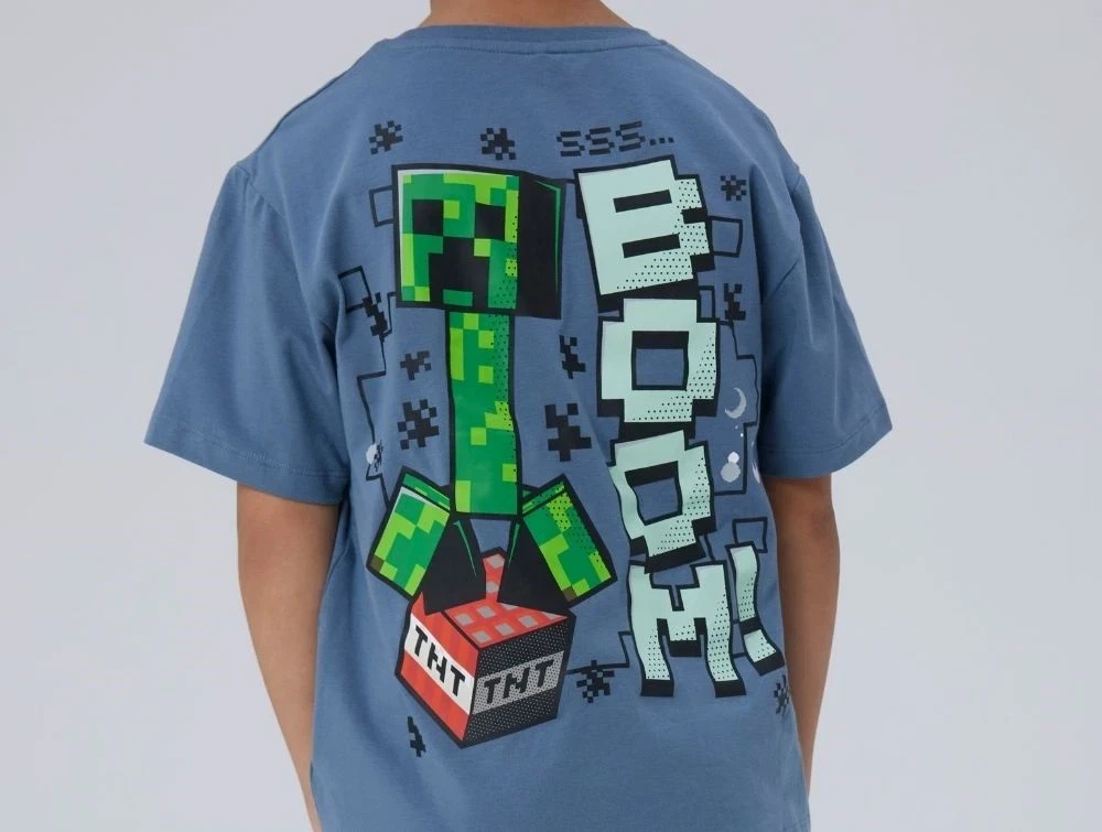 T-shirten har en afslappet pasform, rund hals og korte ærmer. Den er lavet i en blød og strækbar jerseykvalitet, som sikrer høj komfort. Foran er et mindre Minecraft-print med Creepers og teksten "SSSSSSSS", mens bagsiden har et stort print af en Creeper med TNT og teksten "BOOM!" – perfekt til små Minecraft-fans.