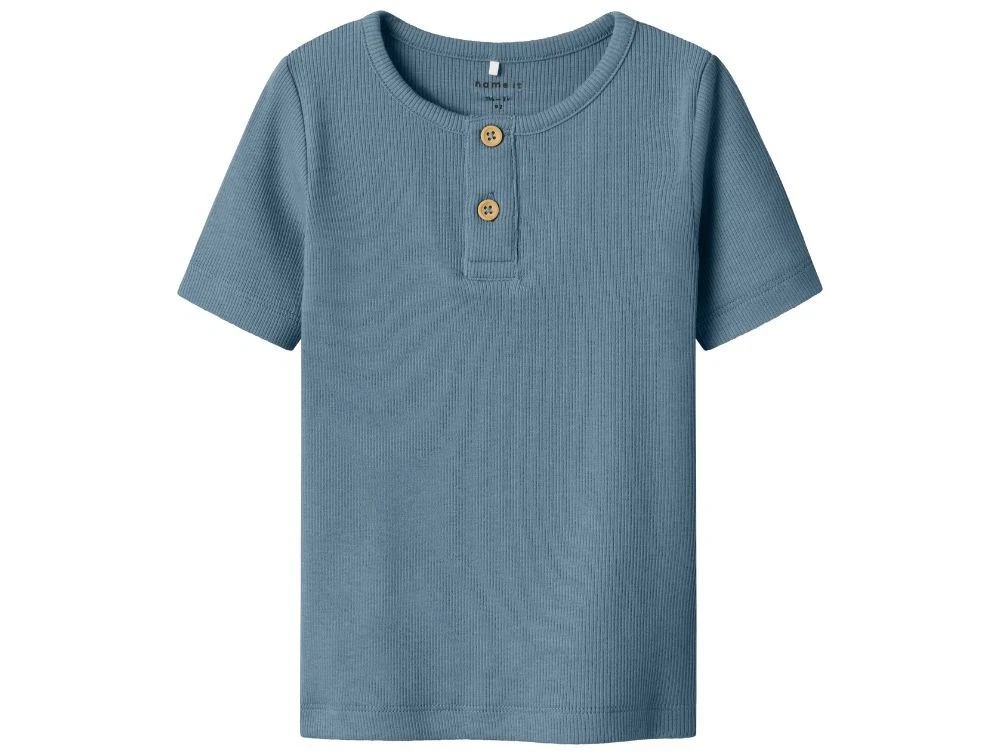 Kortærmet rib t-shirt i blå (spring lake) med to knapper ved halsåbning fra Name It.