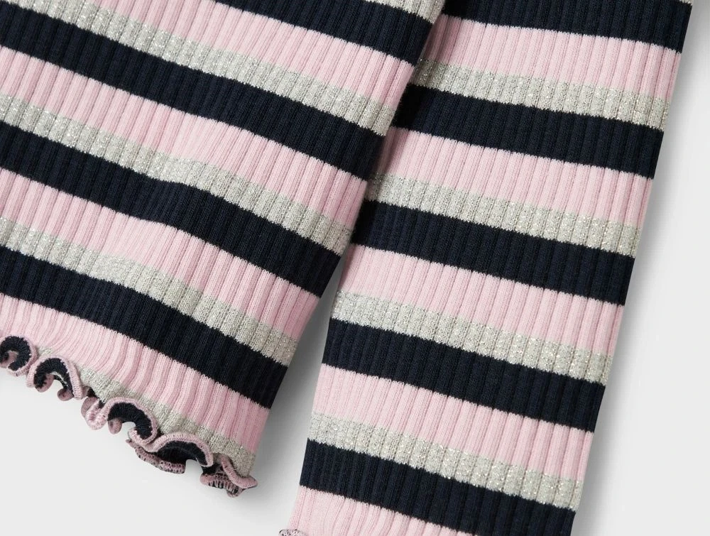 name it t-shirt med rosa og mørkeblå striber og flæsekant, set forfranærbillede af flæsedetalje og stribet rib på langærmet name it t-shirt