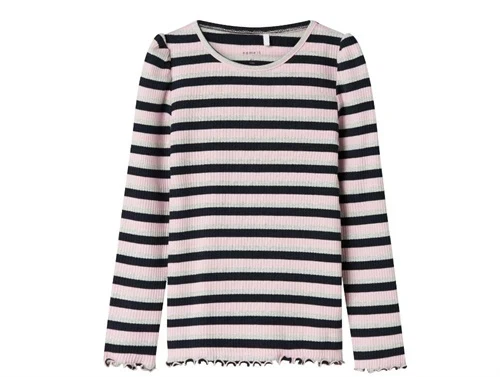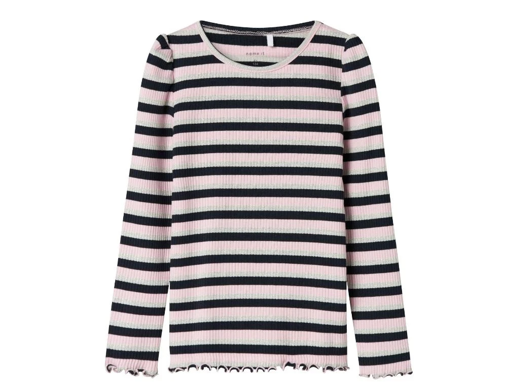 Langærmet t-shirt fra Name It i rosa og mørkeblå (boysenberry) striber med fine flæser ved kanterne og ribstruktur.