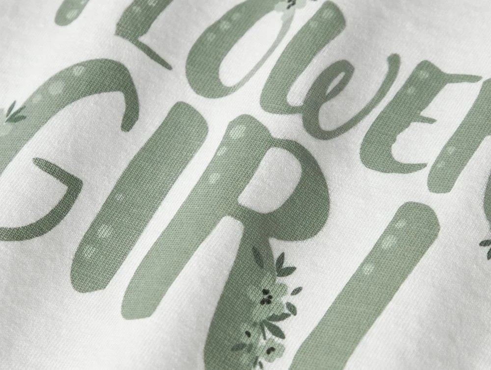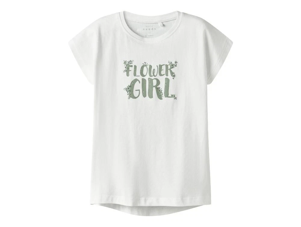 T-shirt i hvid fra Name It med teksten "Flower Girl" i blomstret design foran.