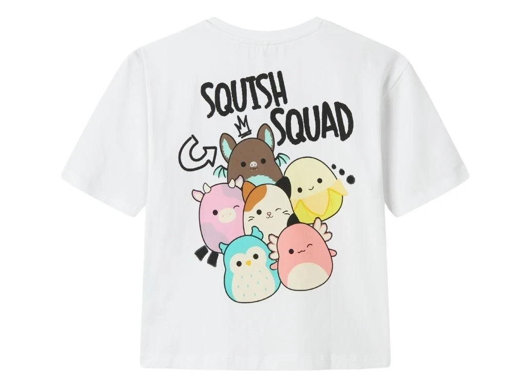 T-shirt i hvid fra Name It med farverigt print af Squishmallows på for- og bagside.