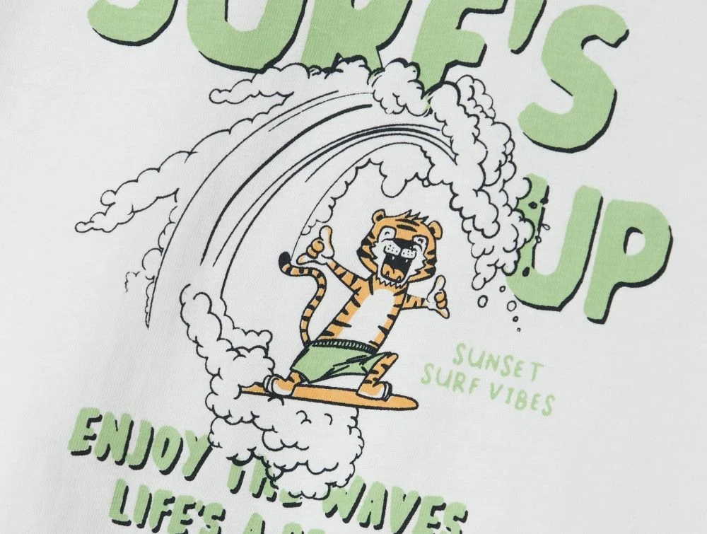 Denne t-shirt er fremstillet i blød jersey af 100% bomuld og har en løs pasform, som giver god bevægelighed. Motivet viser en glad tiger på surfbræt omgivet af teksten "Surf's up" og "Enjoy the waves – life’s a beach".