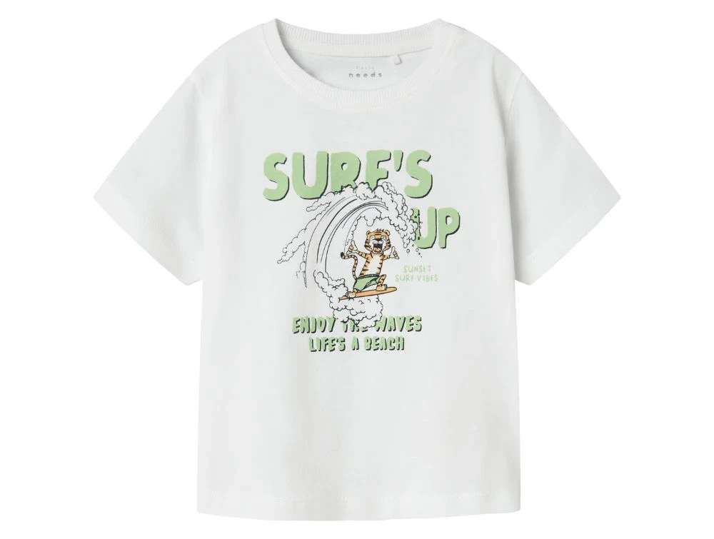 Name It t-shirt i hvid med tiger-print og grøn tekst Name It t-shirt med tiger på surfbræt og teksten SURF\'S UPName It t-shirt i hvid med tiger-print og grøn tekst Name It t-shirt med tiger på surfbræt og teksten SURF\'S UP