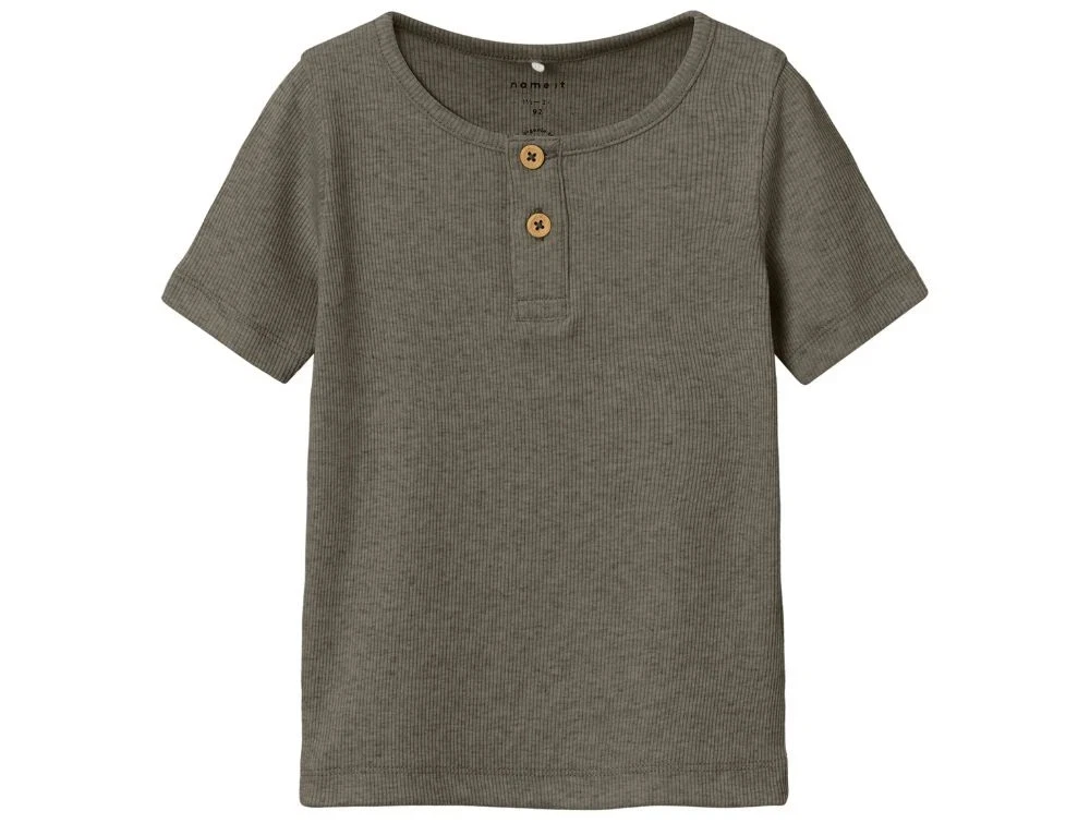 Kortærmet rib t-shirt i bungee cord melange med to knapper ved halsåbning fra Name It.