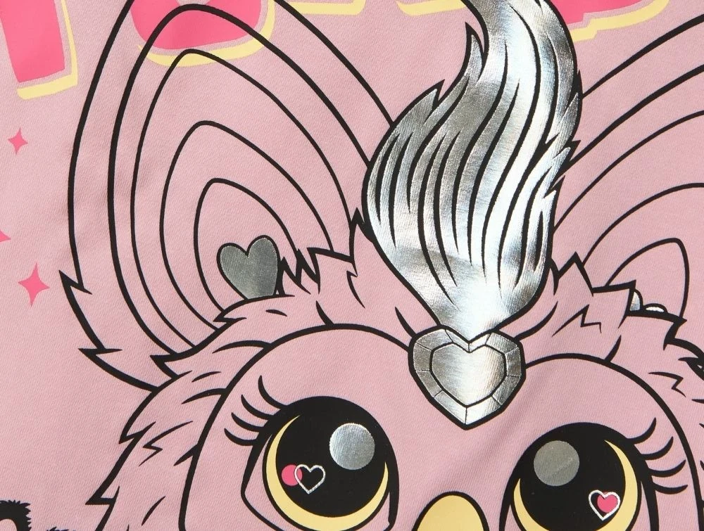 name it t-shirt i rosa med stort furby print og sølvdetaljer, set forfraname it t-shirt i rosa uden print, set bagfranærbillede af metallic tryk og furby øjne på name it t-shirt i rosa