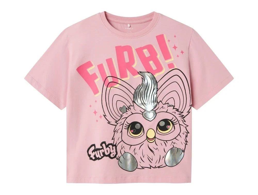 T-shirt i rosa nuance fra Name It med stort metallic Furby-print og teksten “FURB!”.