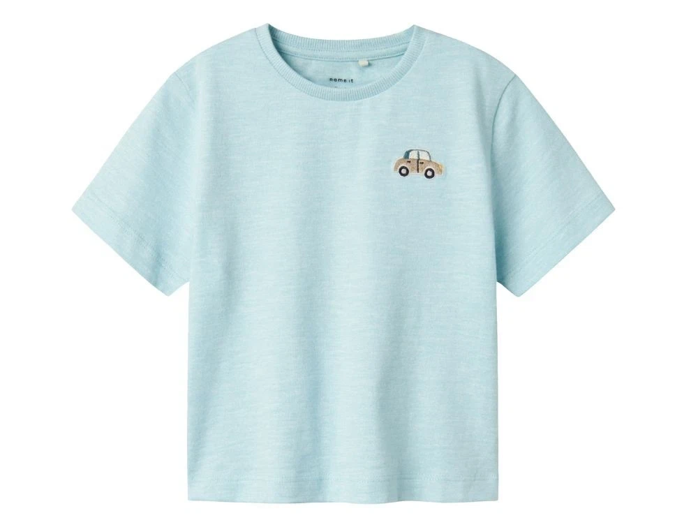 T-shirt fra Name It i turkis (aquatic) med et lille broderet bilmønster på brystet.