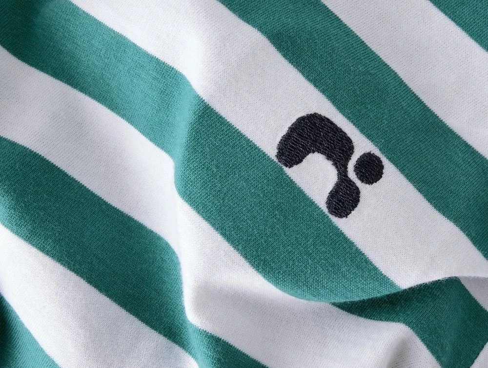 T-shirten er lavet i strækbar bomuldsjersey med klassiske striber og en lille broderet detalje foran. Den har korte ærmer og et behageligt snit til hverdagsbrug.