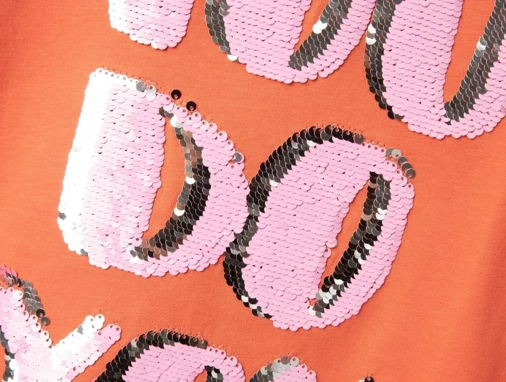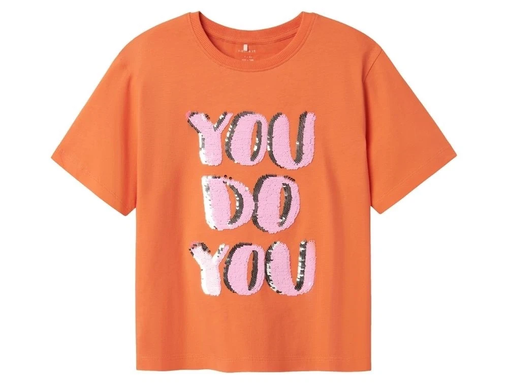 Orange t-shirt fra Name It med paliettekst på fronten.
