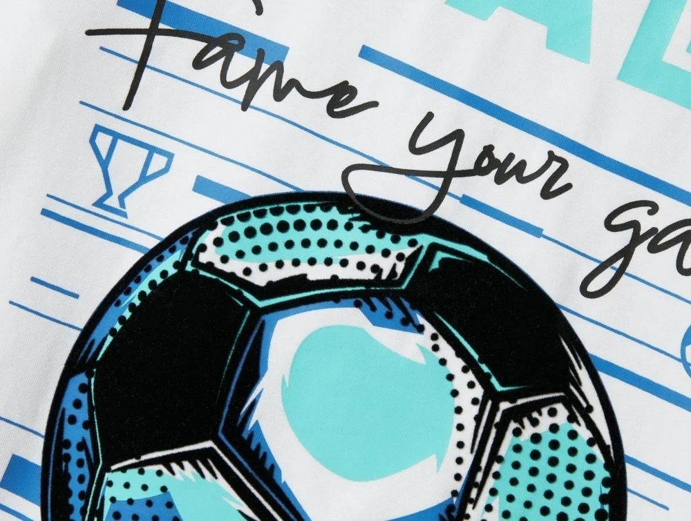 T-shirten har korte ærmer, rund halsudskæring og et farverigt FIFA-print foran i turkis, blå og sorte nuancer. Perfekt til børn, der elsker fodbold og FIFA-universet.