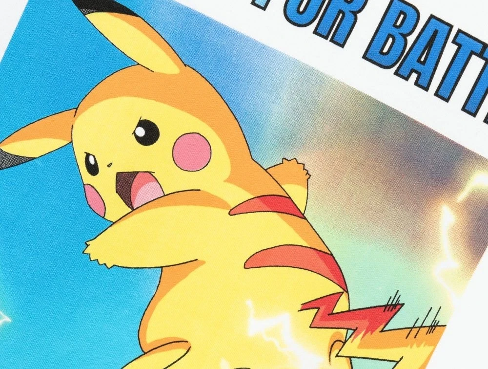 • gummiprint med Pikachu og teksten "READY FOR BATTLE"