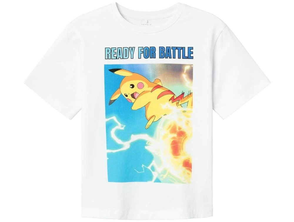 Klassisk kortærmet t-shirt med rund halsudskæring og et stort farverigt print af Pikachu med teksten "READY FOR BATTLE". Printet er lavet som et gummiprint, der giver et let skinnende udtryk og føles blødt mod huden. T-shirten er lavet i en blød og strækbar jerseykvalitet – perfekt til leg og hverdagsbrug.