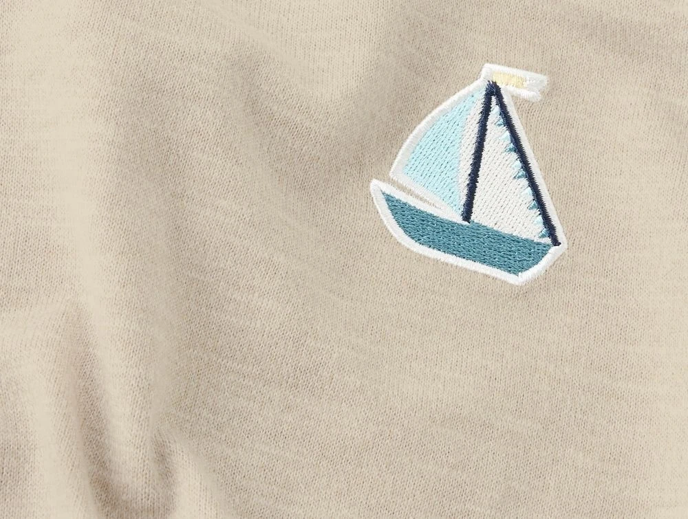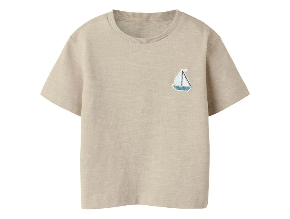 T-shirt fra Name It i beige (island fossil) med et lille broderet bådmotiv på brystet.