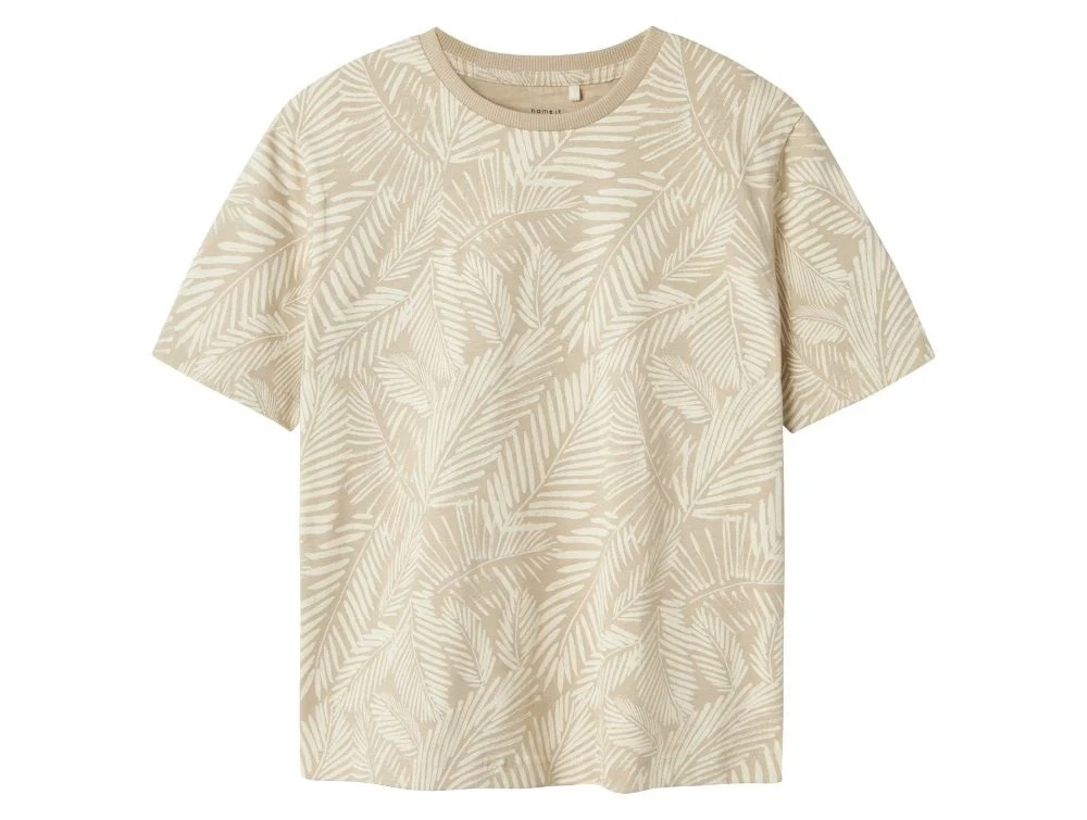 T-shirt i beige fra Name It med palmeprint over hele fladen.