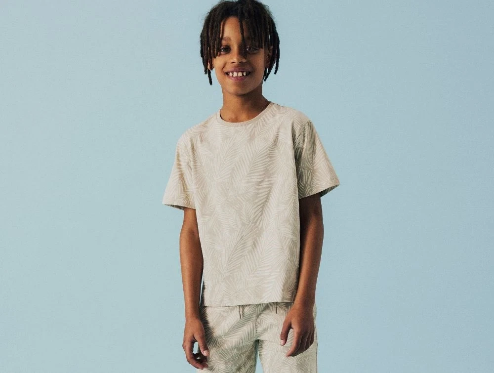 dreng iført name it t-shirt i island fossil med palmeprintname it t-shirt i beige med palmeprint, set forfraname it t-shirt i beige med palmeprint, set bagfranærbillede af palmeprint på name it t-shirt i beige