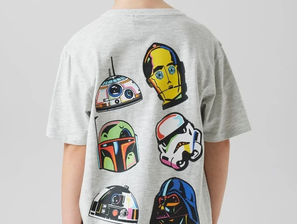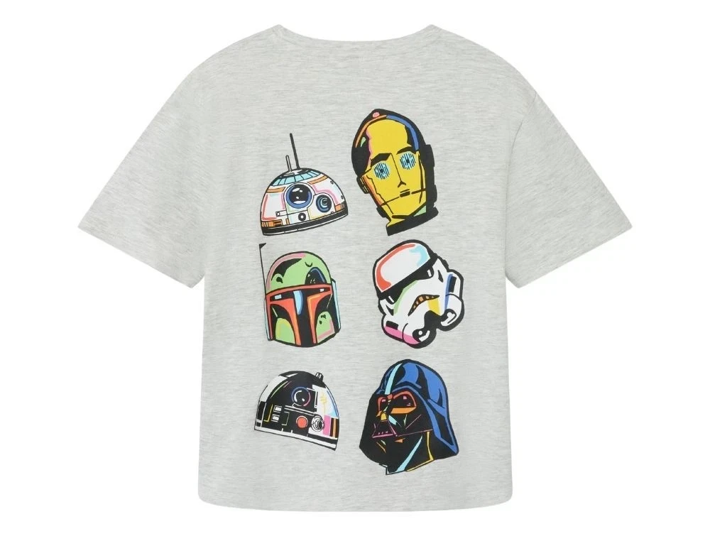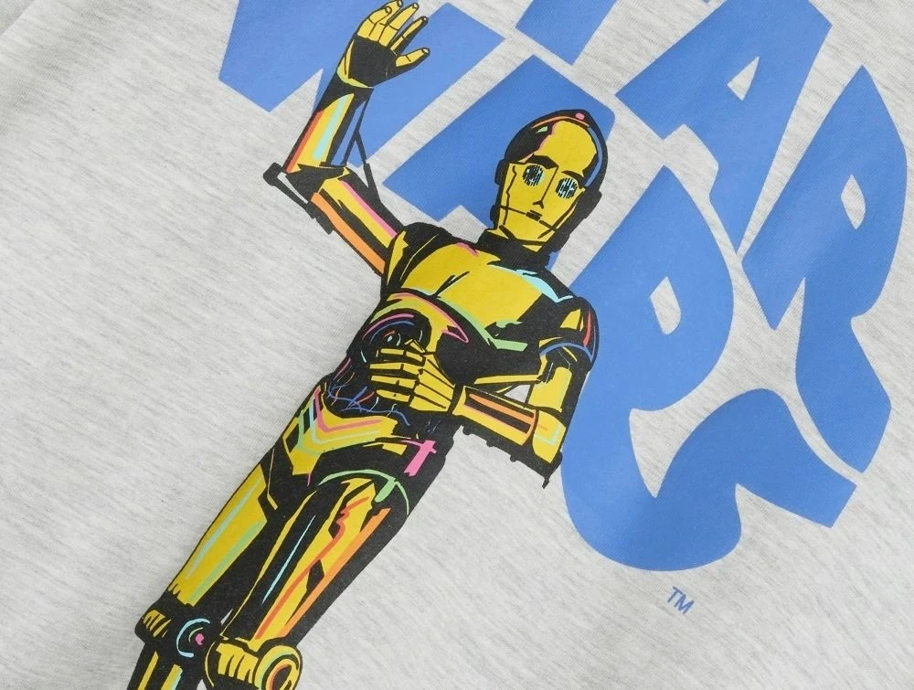 T-shirten har en afslappet pasform, rund hals og korte ærmer. På fronten er der et stort print af C-3PO foran Star Wars-logoet i blåt, og på ryggen ses farverige portrætter af kendte figurer fra Star Wars-universet såsom R2-D2, Darth Vader og en Stormtrooper.