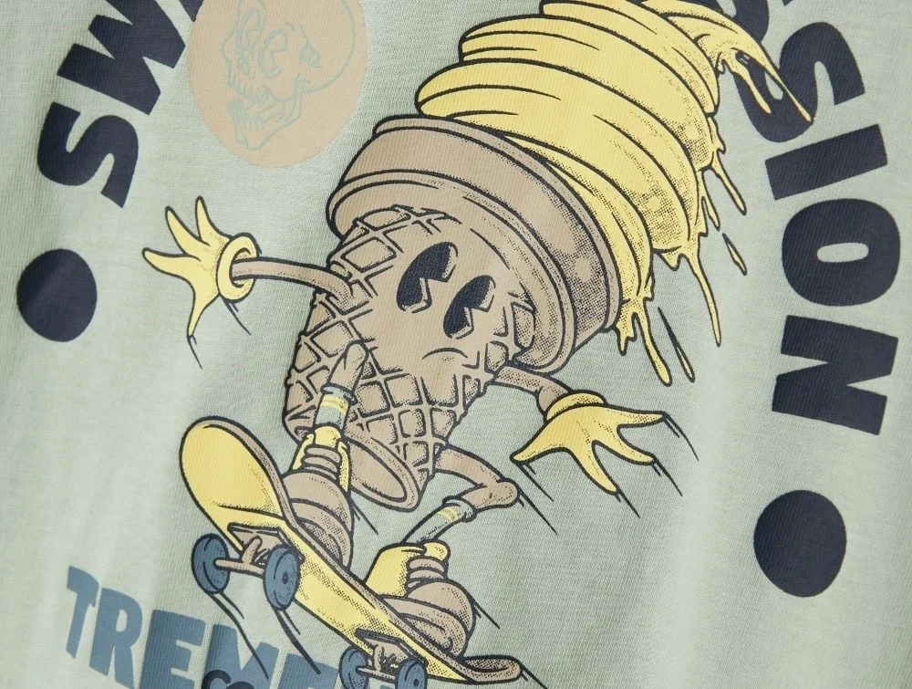 T-shirten har korte ærmer, rund hals og et motiv af en vaffelis på skateboard med teksten "sweet passion - tremendous energy". Farverne i printet er holdt i brun, sort, blå og gul. En sjov og casual T-shirt til sommerens afslappede dage.