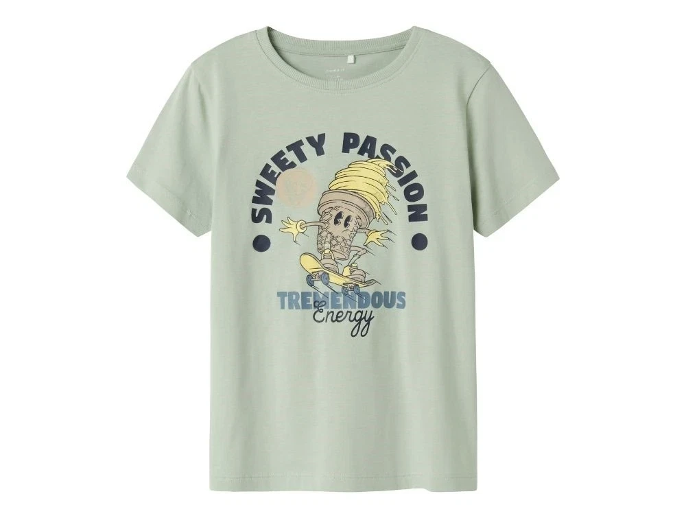 Lysegrøn t-shirt med en vaffelis på skateboard printet på forsiden fra Name It 13242809 aqua grayLysegrøn t-shirt fra Name It 13242809 aqua grayMotiv af en vaffelis på skateboard printet på en lysegrøn t-shirt fra Name It 13242809 aqua gray
