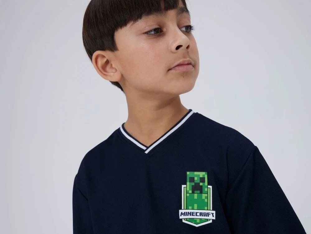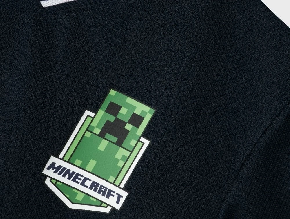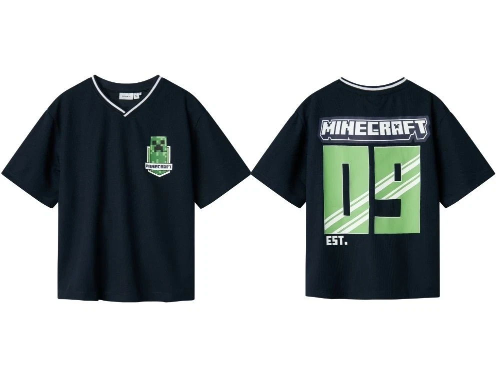 Marineblå t-shirt i let og åndbar mesh-kvalitet med gummiprint af Minecraft på både front og ryg. Modellen har V-hals, korte ærmer og en almindelig pasform. Fremstillet i 100% polyester, som føles let mod huden og tørrer hurtigt – perfekt til aktive børn, der elsker Minecraft-universet.