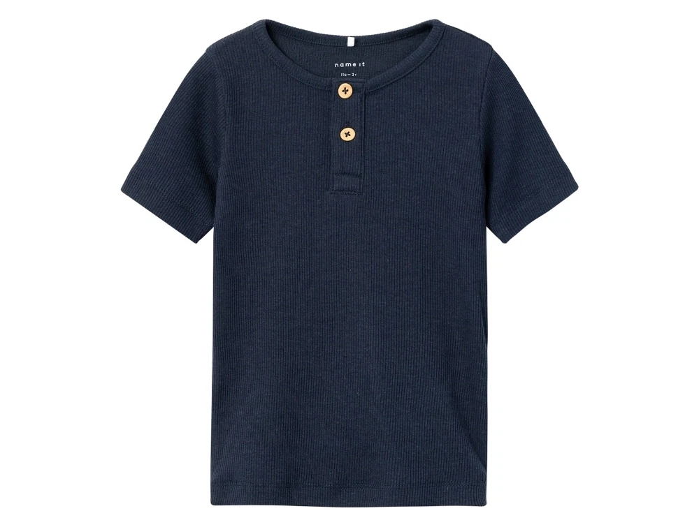Kortærmet rib t-shirt i mørkeblå (dark sapphire) med to knapper ved halsåbning fra Name It.