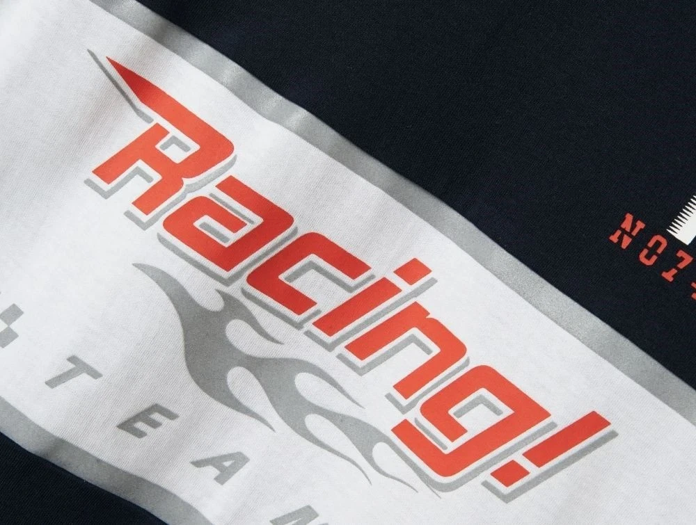 T-shirten har korte ærmer, rund hals og cool color-block detaljer. Den er dekoreret med røde print inspireret af motorsport – både foran og på begge ærmer.