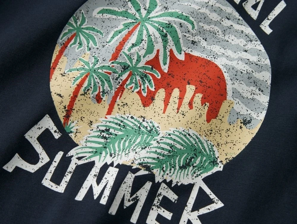 Mørkeblå t-shirt med tropisk strandmotiv fra Name It: